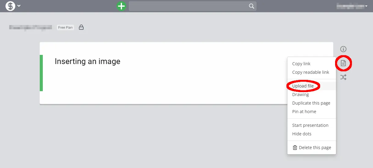 On the right side of the screen, You can also select “Upload file” from the icon (red circle in the image below) and select the file you want to insert.