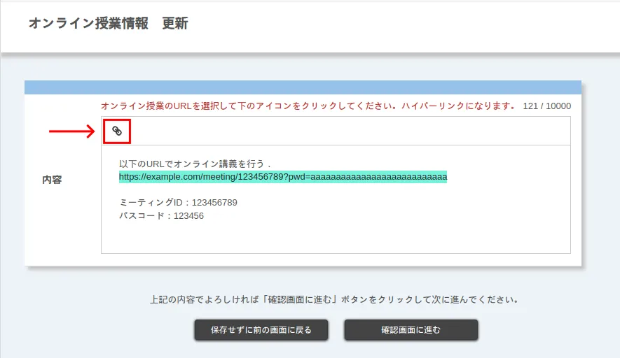 オンライン授業を行う場合は,「オンライン授業情報」にオンライン授業のURLなど,オンライン授業にアクセスするための情報を書いてください.