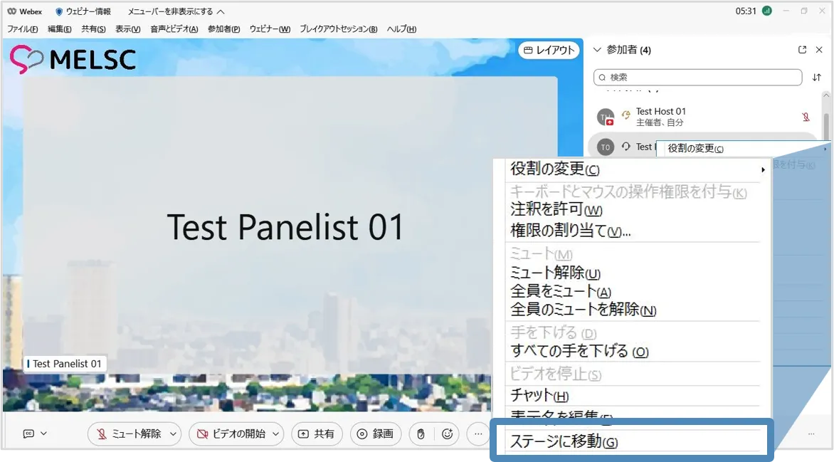 - パネリストの名前の上で右クリックし,メニューを表示します.メニュー内にある「ステージに移動」を選択します.